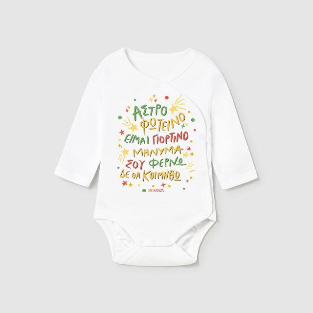 - Βρεφικό Κορμάκι “Άστρο Φωτεινό” – 100% βαμβάκι, δικό μας αποκλειστικό σχέδιο και διαθέσιμο σε μεγέθη 0–6 ή 6–12 μηνών· γιατί ας είμαστε ειλικρινείς, το μωρό το εννοεί.